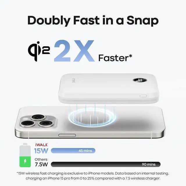15W Qi2 Wireless Charging Say goodbye to long waits and tangled cables. With 15W Qi2 wireless fast charging, you can cut your charging time in half. Just snap your phone onto the wireless power bank and let the enhanced magnetic alignment lock it perfectly in place while power flows instantly. Ideal for travel, work, or weekend adventures where every minute counts