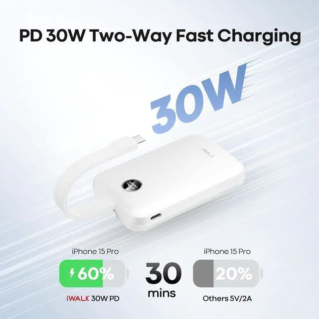 Fast Charging On the Go With 30W USB-C two-way fast charging, this powerbank fast charging bank can boost your iPhone 15 Pro to 60% in just 30 minutes. The dual USB-C ports and included charging cable make it easy to stay powered anytime, anywhere