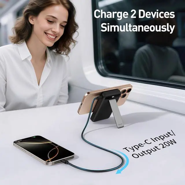 Integrated Foldable Stand The sleek, all-aluminum foldable stand supports up to a 60° viewing angle, turning your power bank for iphone into a hands-free streaming or video call station. Ideal for desks, flights, or nightstands, it makes multitasking effortless while keeping your phone fully powered.