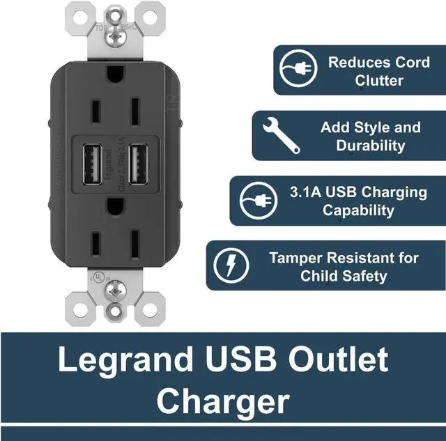 Legrand Radiant TM826USBBKCCV4 15 Amp Decorator Duplex Tamper Resistant Outlet Receptacle with 3.1A Type A USB Charger, Black (1 Count)
