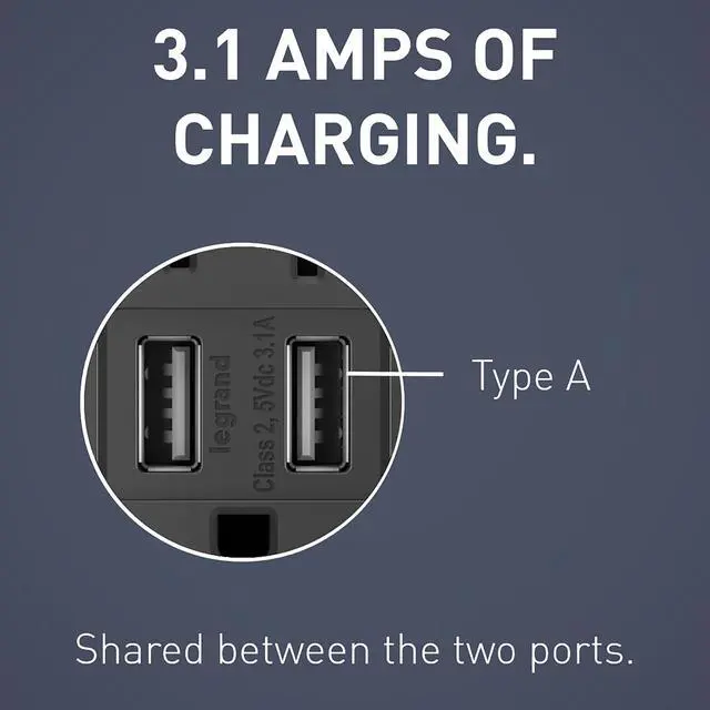 Charge without bulky AC adapters. Includes two 5-volt DC USB ports that work with USB 2.0 & 3.0 compatible devices. 3.1A total USB charging capability shared between both ports.