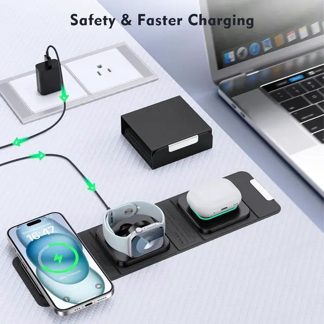 3 IN 1 Magnetic Wireless ChargerOur foldable Mag-safe Charger is equipped with a 18W adapter allowing you to fully charge your device in just 2 to 2.5 hours - 25% faster than other wireless chargers. It supports for iPhone 16 15 series/14/14 Pro/14 Plus/14 Pro Max/13/13 Pro/13 Pro Max/12/12 Pro/12 Pro Max It is also compatible with Watch Ultra 9 8 7 6 5 4 3 2 and AirPods with wireless charging. Magnetic Alignment and Strong AdsorptionOur 3 in 1 Charging Staton featuring magnets ensures effortless alignment with your Phone charging coil guaranteeing a fast and stable charging experience.