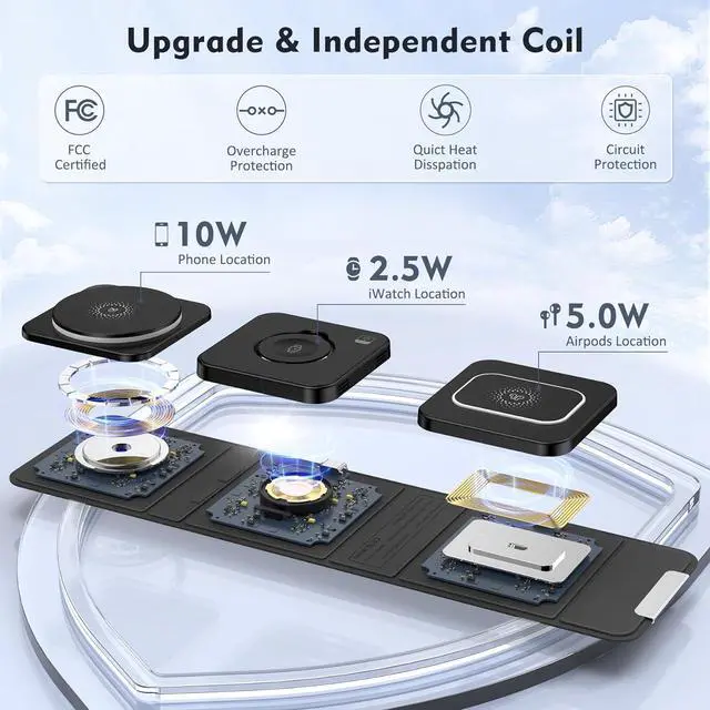 No more fumbling around trying to find the perfect position - Simply place your iPhone on the charger and let it do the rest. Superior Safety and DurabilityOur Wireless Charging Pad with advanced FCC certification and upgraded chips offers temperature control voltage protection and short circuit pre ensuring both efficiency and safety during charging. Plus With professional magnetic isolation sheet inside it emits no radiation strive to protect the safety of you and your family. Travel Essential Folding ChargerOur travel charger for multiple devices designed with a modern and elegant leather-clad style adds a touch of sophistication to any space.