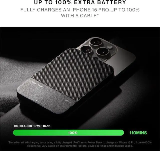 • HIGH CAPACITY: Equipped with 5000mAh, (Re)Classic Power Bank ensures you stay powered all day with an extra charge and can even fully charge an iPhone 15 Pro to 100%