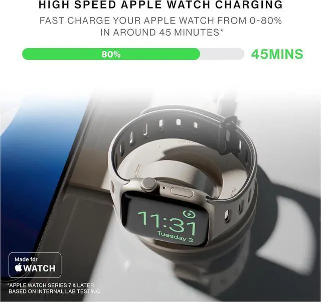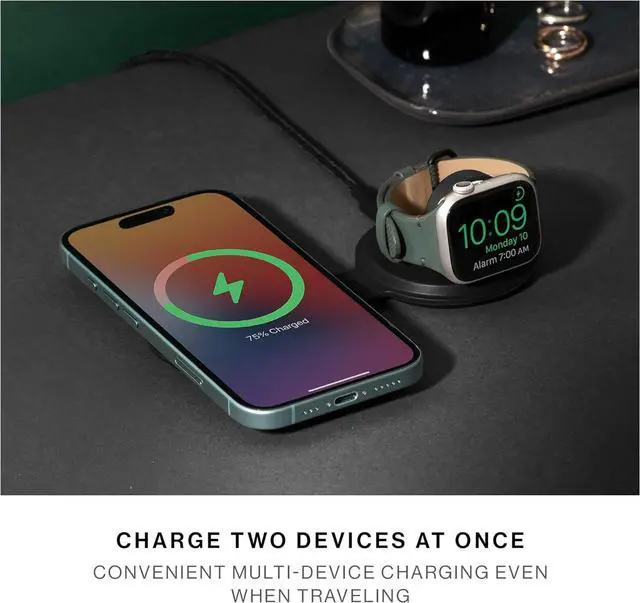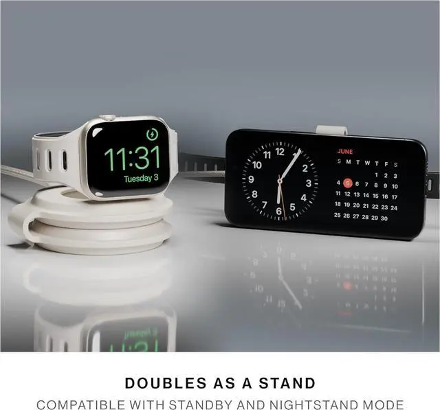 Both a charging pad and a charging stand, Voyage 2-in-1 Magnetic Wireless Charger folds the other way to hold up your phone to stream, call, and use with StandBy. The magnetic watch puck can also be tilted upright to work perfectly with Apple Watch's Nightstand Mode.