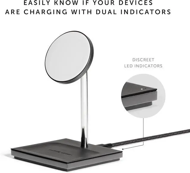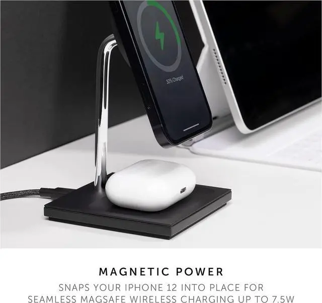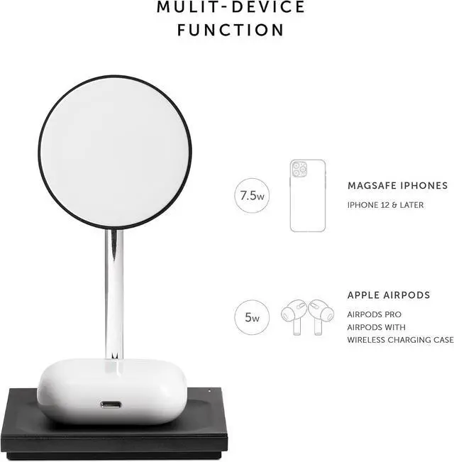 Snap your iPhone 12, 13, 14, 15, 16 range to the charging stand & drop your AirPods (Pro) in the wireless tray for convenient 2-in-1 power for your most essential devices.