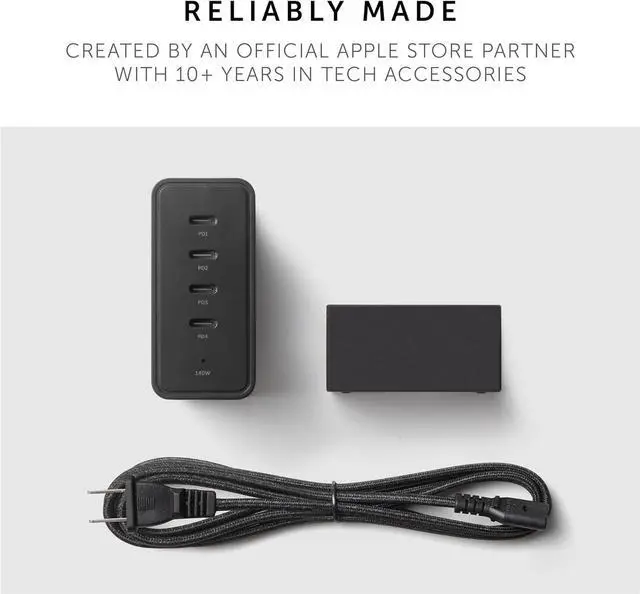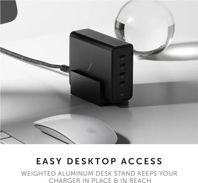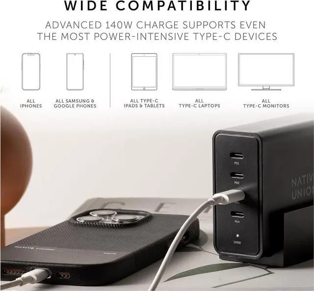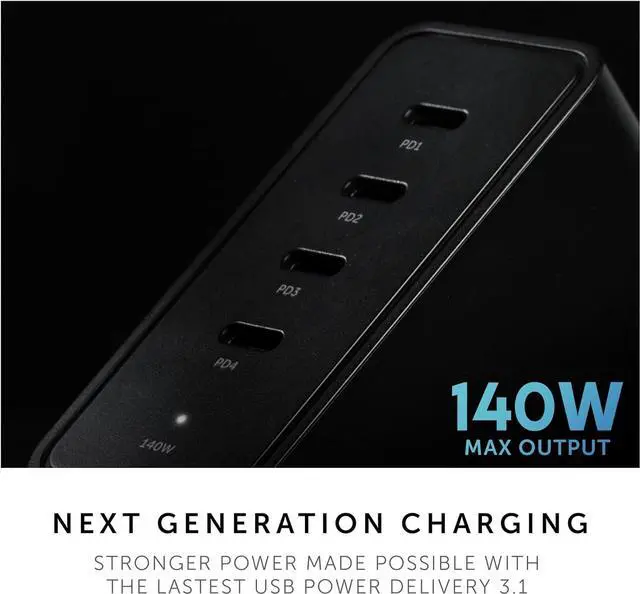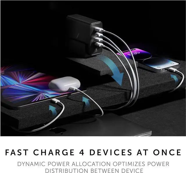 Charge up to 4 devices at once with 4 USB-C ports. Dynamic power allocation ensures optimized power distribution between devices, and directs the full 140W of power to any port when charging a single device.