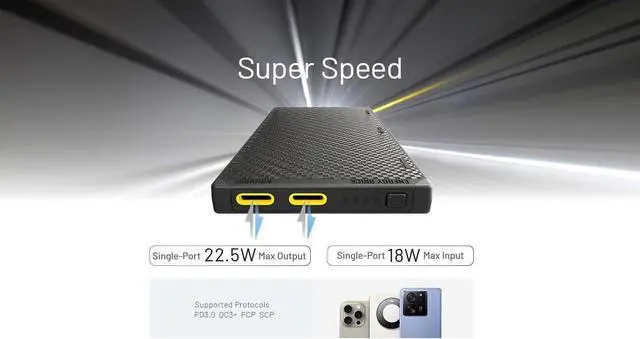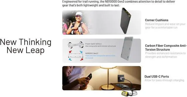 The Nitecore NB10000 Gen3 is a lightweight carbon fiber power bank with a 10,000 mAh capacity and 22.5W fast charging. Weighing only 150 g, it features dual USB-C ports, a carbon fiber composite anti-torsion structure, and 4 corner cushions, ideal for powering smartphones, headlamps, flashlights, earphones, and more. The power bank is crafted with dual-sided carbon fiber sheets, secured by 12 machine keys to form a carbon fiber composite anti-torsion structure. This not only enhances its durability but also ensures a sturdy and reliable performance. Featuring dual USB-C ports, the NB10000 Gen3 can charge two devices simultaneously, making it easy to keep multiple gadgets powered up. It also supports pass-through charging, so you can charge the power bank while powering up your devicewithout extra waiting time. Weighing just 150g (5.29 oz), with a structural weight of only 14.5g (0.51 oz), the NB10000 Gen3 perfectly balances lightweight design with impressive durability. It's the ideal choice for anyone seeking a compact and sturdy power solution for trail running.