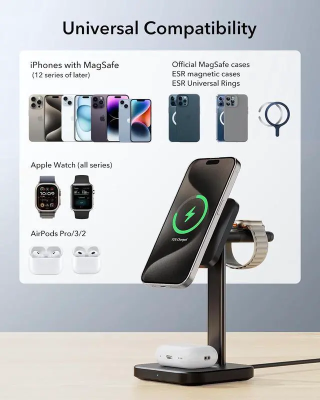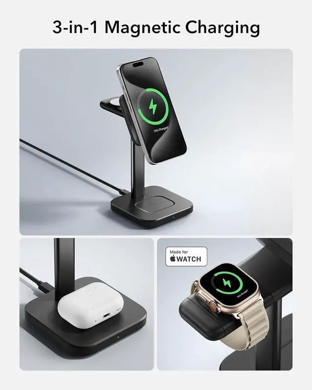 3-in-1 Magnetic Charging: this compatible with MagSafe charger will charge your iPhone, AirPods, and Apple Watch together; compatible with iPhone 16/15/14/13/12 series, AirPods Pro 4/3/2, Apple Watch Ultra, Apple Watch Series 8/7/6/5/4/3/2/1, and Apple Watch SE 2/1
