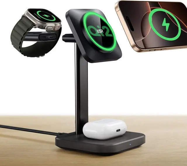 3-in-1 Magnetic Charging: this compatible with MagSafe charger will charge your iPhone, AirPods, and Apple Watch together; compatible with iPhone 16/15/14/13/12 series, AirPods Pro 4/3/2, Apple Watch Ultra, Apple Watch Series 8/7/6/5/4/3/2/1, and Apple Watch SE 2/1