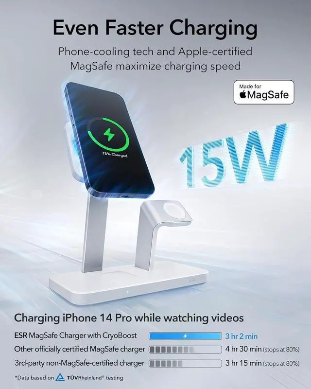 The video showcases the product in use.The video guides you through product setup.The video compares multiple products.The video shows the product being unpacked. Apple-certified 15W MagSafe charging and CryoBoost tech combine for even faster charging speeds. Standard MagSafe-style chargers create heat that slows down charging. CryoBoost keeps your phone cooler and charging speeds at their maximum so you can keep charging at 15W for longer.