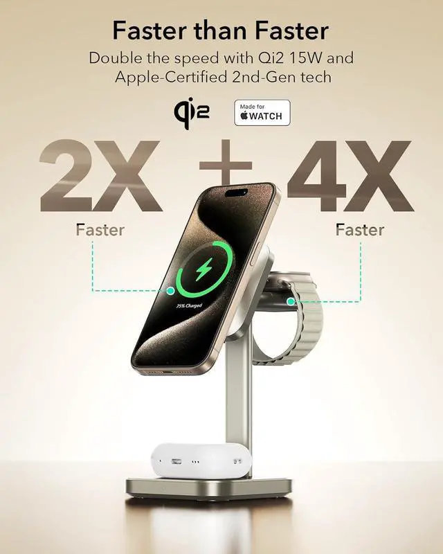 ESR Qi2 3-in-1 Wireless Charging Station, [Certified] Apple Watch Charger & 15W MagSafe Charger Stand for iPhone, Wireless Charger for iPhone 16/15/14/13 Series, Watch & AirPods 4/3, Light Tan