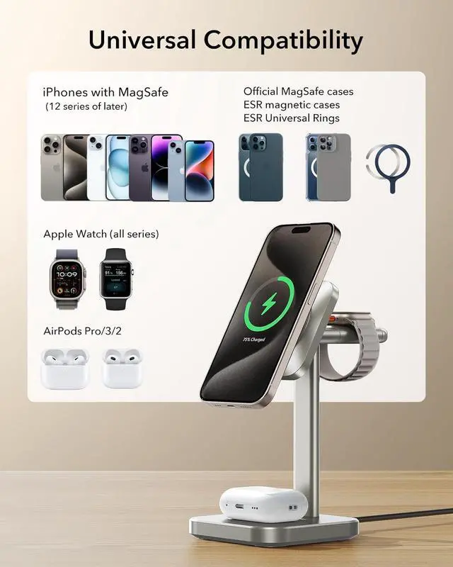 • 3-in-1 Magnetic Charging: this compatible with MagSafe charger will charge your iPhone, AirPods, and Apple Watch together; compatible with iPhone 16/15/14/13/12 series, AirPods Pro 4/3/2, Apple Watch Ultra, Apple Watch Series 8/7/6/5/4/3/2/1, and Apple Watch SE 2/1