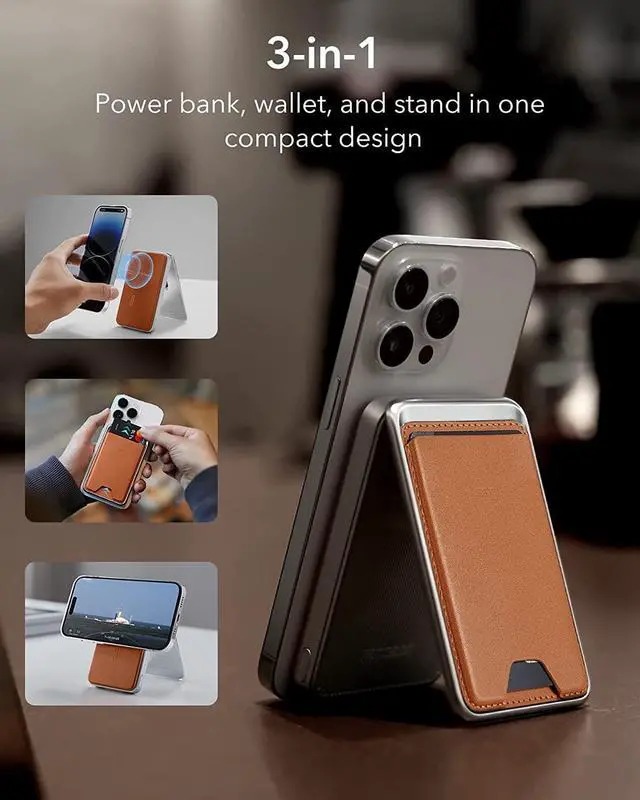 ESR 5,000mAh Wallet Power Bank with MagSafe, Designed for MagSafe Battery Pack, Adjustable Stand with USB-C Cable, Portable Charger for iPhone 15/14/13/12 Series(Except 13/12 Mini), Caramel Brown