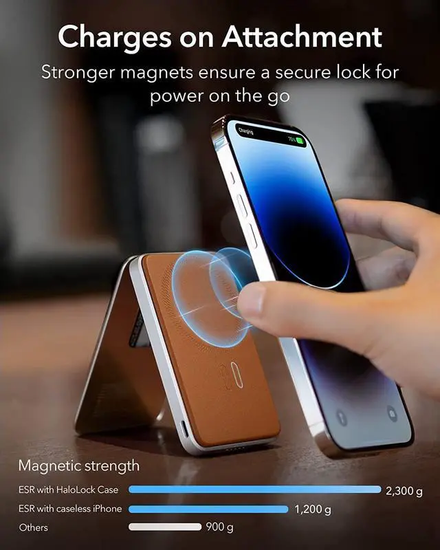 Simply attach the power bank to your iPhone to begin charging. The powerful magnets automatically align the power bank with your phone and smart charging tech takes care of the rest. Whats more, the 1,200 g of holding force ensures that it stays securely locked on when youre out and about.