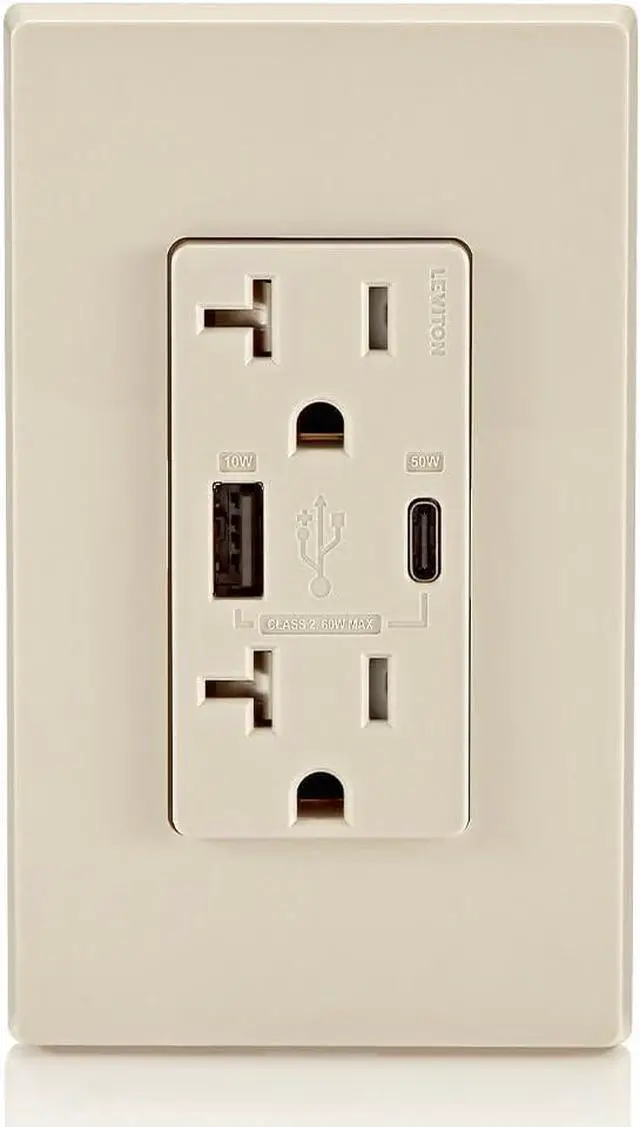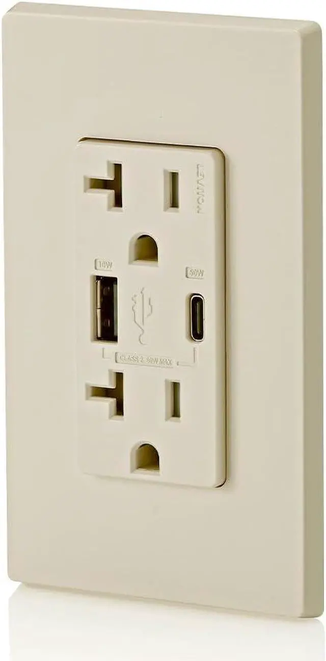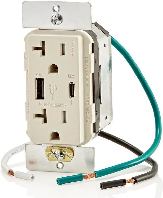 [email protected]+ 5V@2A), Dual Type A/Type-C Power Delivery USB Charger, Grounding, Wire Leads - Light Almond