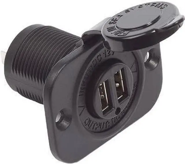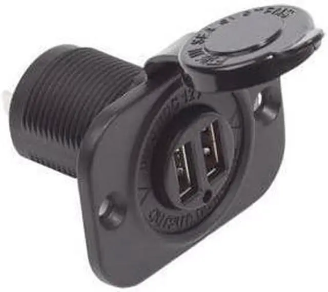 Dual USB Charger Socket Conveniently Charge Popular USB-Powered Mobile Devices Protective cap with tether keeps dust and spray from shortening the life of the charger. Made with materials which ensure a solid contact and low voltage drop. Blue Sea's 1016 Dual USB Charger Socket is easy to install in an existing 12 VDC socket hole providing convenient access for charging mobile devices. Includes: 2 USB ports Watertight cap Features: Watertight cap Corrosion resistant materials Protected from overheating Easy installation Specifications: USB: 2.0 Input Voltage: 12V DC Output Voltage: 5V DC +/- 5% Max. Output Current: 2.1A DC Cut Out Dimensions: 1-3/16" Dia. FCC Part 15: Subpart B Compliant