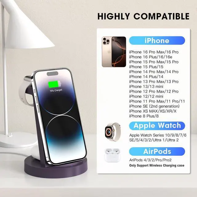 | Compatible Phone Models | [iPhone]iPhone 17, 17 Pro, 17 Pro Max, iPhone Air,iPhone 16e,iPhone 16 Pro Max, iPhone 16 Pro,iPhone 16 Plus,iPhone 16,iPhone 15 Pro Max, iPhone 15 Pro,iPhone 15 Plus,iPhone 15, iPhone 14 Pro Max, iPhone 14 Pro, iPhone 14 Plus, iPhone 14, iPhone 13 Pro Max, iPhone 13 Pro, iPhone 13, iPhone 13 mini, iPhone 12 Pro Max, iPhone 12 Pro, iPhone 12, iPhone 12 mini, iPhone 11 Pro Max, iPhone 11 Pro, iPhone 11, iPhone SE (2nd generation), iPhone XS MAX, iPhone XS, iPhone XR, iPhone X, iPhone 8 Plus, iPhone 8 [Apple Watch]Apple Watch Series 10,Apple Watch Series 9,Apple Watch Ultra 2,Apple Watch Ultra 1,Watch Series 8, Apple Watch Series 7, Apple Watch Series 6, Apple Watch Series SE, Apple Watch Series 5, Apple Watch Series 4, Apple Watch Series 3, Apple Watch Series 2[AirPods]AriPods Pro 2, AriPods Pro, AriPods 4AriPods 3AriPods 2(Note: for AirPods 2/3/4, needs work with a wireless charging case ) |