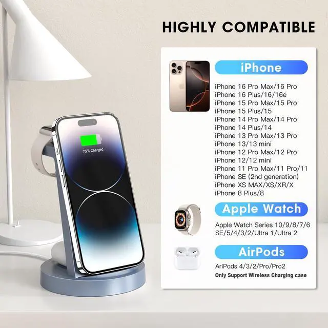 | Compatible Phone Models | [iPhone]iPhone 17, 17 Pro, 17 Pro Max, iPhone Air,iPhone 16e,iPhone 16 Pro Max, iPhone 16 Pro,iPhone 16 Plus,iPhone 16,iPhone 15 Pro Max, iPhone 15 Pro,iPhone 15 Plus,iPhone 15, iPhone 14 Pro Max, iPhone 14 Pro, iPhone 14 Plus, iPhone 14, iPhone 13 Pro Max, iPhone 13 Pro, iPhone 13, iPhone 13 mini, iPhone 12 Pro Max, iPhone 12 Pro, iPhone 12, iPhone 12 mini, iPhone 11 Pro Max, iPhone 11 Pro, iPhone 11, iPhone SE (2nd generation), iPhone XS MAX, iPhone XS, iPhone XR, iPhone X, iPhone 8 Plus, iPhone 8 [Apple Watch]Apple Watch Series 10,Apple Watch Series 9,Apple Watch Ultra 2,Apple Watch Ultra 1,Watch Series 8, Apple Watch Series 7, Apple Watch Series 6, Apple Watch Series SE, Apple Watch Series 5, Apple Watch Series 4, Apple Watch Series 3, Apple Watch Series 2[AirPods]AriPods Pro 2, AriPods Pro, AriPods 4AriPods 3AriPods 2(Note: for AirPods 2/3/4, needs work with a wireless charging case ) |