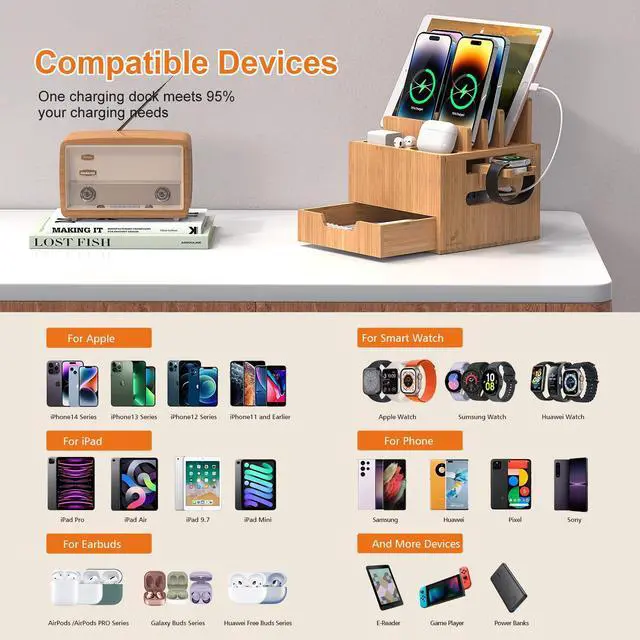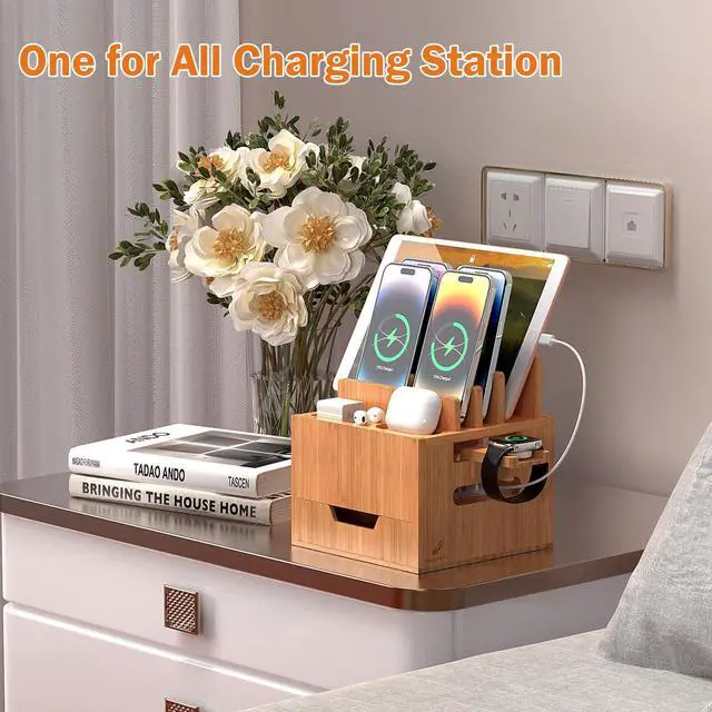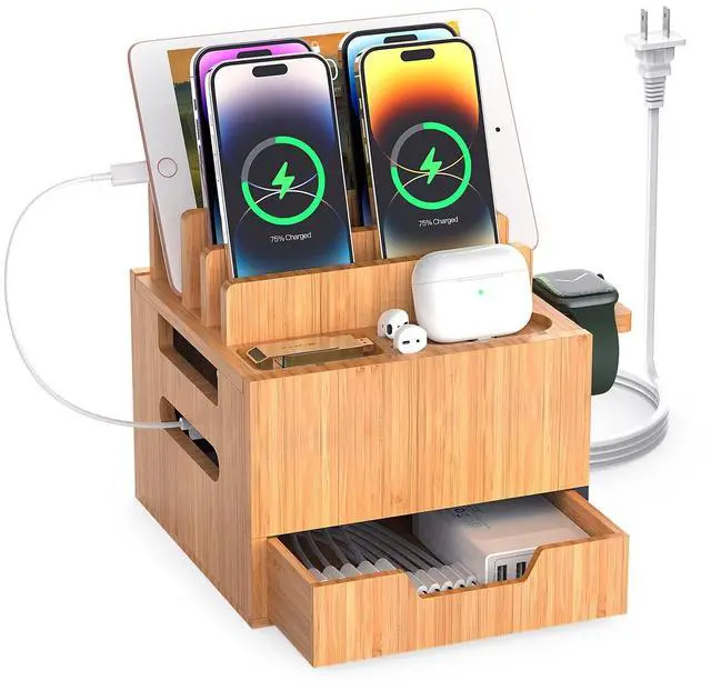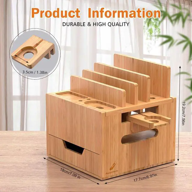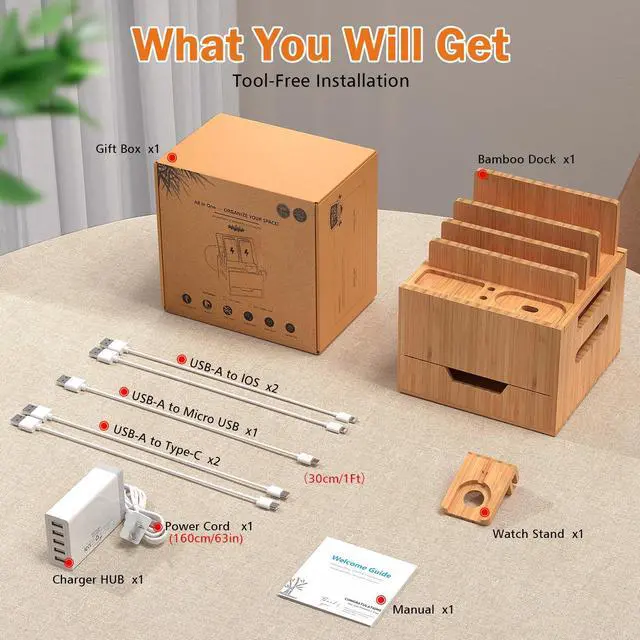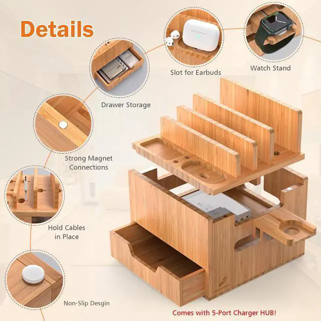 | Included Components | 1x Bamboo Dock Rack with Drawer, 1x Charger Power Supply (USB HUB 5Ports), 1 Set of 5 Cables (2x lightening cables, 1x Android cable, 2x Type-C cables), 1x Extra Hanging Dock Stand for Smart Watch |
