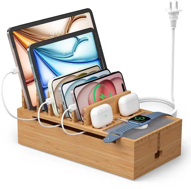 Charging Station for Multiple Devices: Pezin & Hulin charging station is made of solid bamboo that will last for years to come.It can hold up to 8 devices, keep all your devices in one place without having to deal with cables running around everywhere. It is ideal for company, office, living room, bedroom, kitchen, hotel, restaurants and classroom. 5-port Charger HUB and 5 Cables: 5 USB output ports are provided to charge up to 5 devices simultaneous. The charger can also be used separately, which is relatively small and easy to carry. (Attention: Not include watch charger). Larger and Wider Base: The dock Station have a larger and wider base (Size 28 x 15 cm) sultable for a variety of power supplies. It can easily store the power strip and hide the cables for greater safety. Four anti-slip pads on the bottom increase the stability. Creative Design: Our Charging Station designed with a wide flat tray with felt pad not only aesthetic, but also can prevent your items from being scratched. Spacious 6 baffles can hold your phones, tablets or game consoles no matter how thick case on. 2 special grooves can organize your earbuds (Each part is designed with data cable holes for easy charging and hold cables in place). What You Can Get: 1 x Pezin & Hulin Bamboo Charging Station, 1 x 5-Port USB Charger HUB & Cord, 6 x Short USB Cables (3pc Type-C, 2pc for lPhone & lPad, 1pc Android) for your daily use, 1 x user manual.
