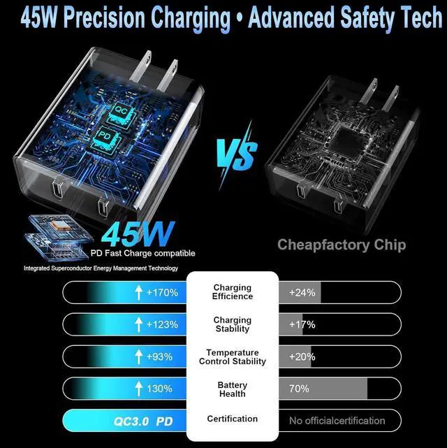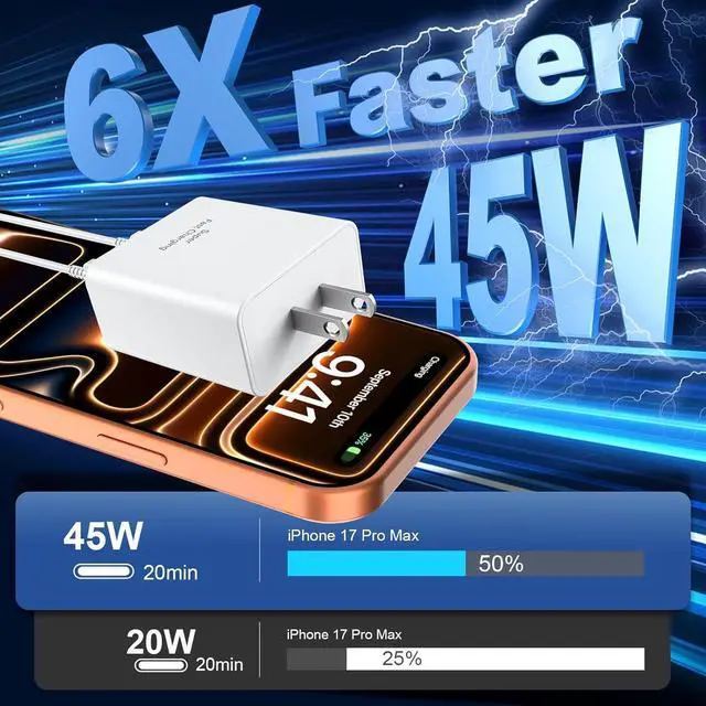| Compatible Devices | The 45W Fast Charger supports for iPhone 17/iPhone 17 Air/iPhone 17 Pro/iPhone 17 Pro Max/ iPhone 16 Pro/16 Pro Max/16/16 Plus,iPhone 15 Pro/15 Pro Max/15/15 Plus;forAirPods Pro(2nd generation)/AirPods 4/AirPods Max 2 (2024 Release); for iPad Pro 13/12.9/11 in,iPad 10/11th(A16),iPad Air 4th/5th,iPad mini 6/7th. |