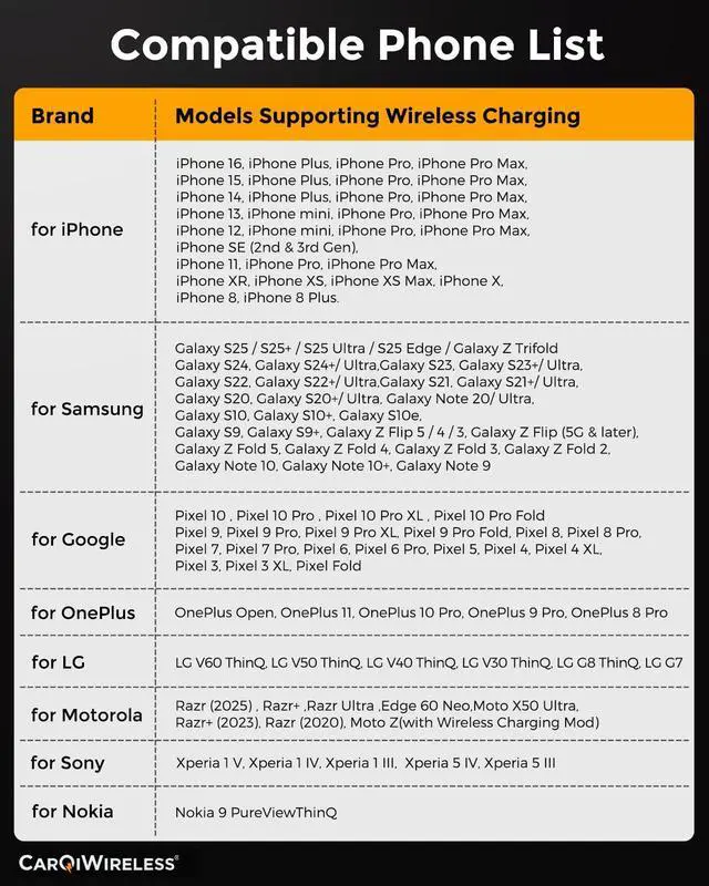 | Compatible Phone Models | [COMPATIBLE PHONES]: CarQiWireless charger is compatible with iPhone 16/ iPhone 16 Plus/iPhone 16 Pro/ iPhone 16 Pro Max/iPhone 15/iPhone 15 Pro/iPhone 15 Pro Max/iPhone 15 Plus/ iPhone 14 / 14 Pro / 14 Pro Max/ 13 Pro Max / 13 Pro / 13 / 13 Mini / iPhone 12 Pro / 12 / 12 Mini / SE (2020) / 11/ 11 Pro / 11 Pro Max / XS Max / XR / XS / X / 8 / 8 Plus/ Galaxy S22/Galaxy S22+/Galaxy S22 Ultra/Galaxy S23/Galaxy S23+/Galaxy S23 Ultra/Galaxy S20 / S10 / S9+ / S9 / S8 / S8+ / S7 edge / S7 / S6 edge/Note 10 / Note 9 / Note 8 / Note 7/Pixel 3 / Pixel 3XL and All CarQiWireless enabled phones and devices |