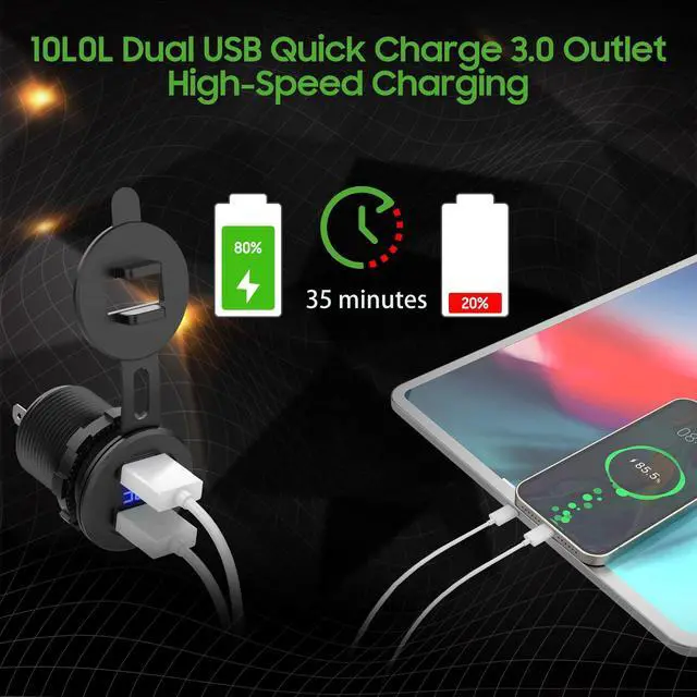 Fast charger socket with dual USB ports, provide 4x faster than normal ones (It can charge QC-compatible devices up to 80% in 35 minutes)