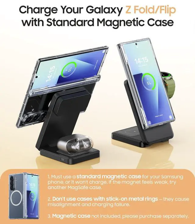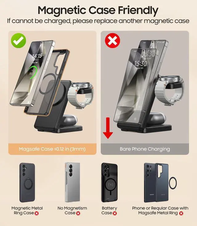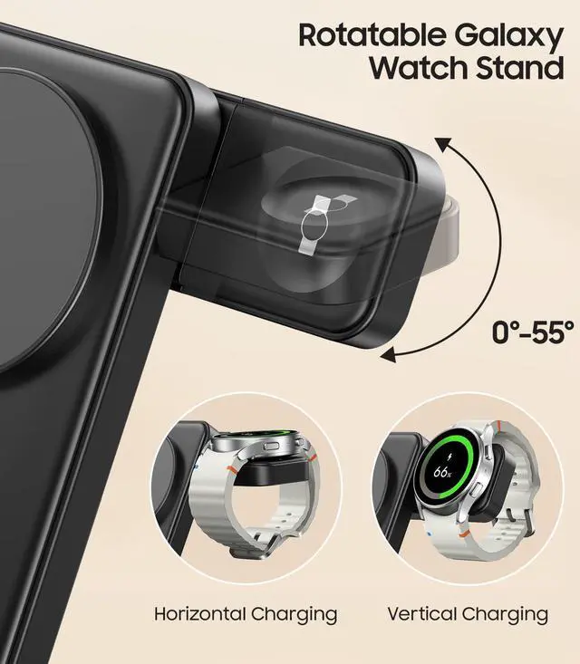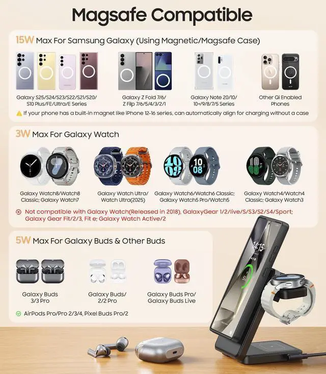 | Compatible Devices | [Buds]Galaxy 3/3 Pro; Galaxy Buds/2/2 Pro; Galaxy Buds Pro/Live & other supports wireless charging Buds, [Phones]Galaxy S25 Ultra/S25 Plus/S25/S25 Edge/S24 Ultra/S24 Plus/S24/S23 Ultra/ S23 Plus/S23 /S22 Ultra/ S22 Plus/S22/S21 Ultra/ S21 Plus/S21/ S20 Ultra/S20 Plus/S20; Galaxy Z Fold /Z Filp 7/6/ 5/4/3/2/1; Galaxy S10/S10e/S10+/S9/S9+; Galaxy Note20/10/9/8; [iPhone] iPhone 16e/16/16 Pro/16 Plus/16 Pro Max/15/15 Pro/15 Plus/15 Pro Max/14/14 Pro/ 14 Pro Max/14 Plus/iphone 13/12/11(Pro/Pro Max)/Xs Max/Xs/Xr/X/ SE / 8/8 Plus(For iPhone 12-16 series, it supports magnetic charging with the phone alone or with a magnetic case); [Google Pixel] Google Pixel 9 Pro/ 9 Pro XL/ 9/9a /8 Pro/ 8a/ 8/ 7 Pro/ 7a/ 7; Pixel 6 Pro/6, Pixel 5, Pixel 4/4XL, Pixel 3/3XL and Other Qi-enabled Phones, [Samsung Galaxy Watches ONLY]Galaxy Watch8, Galaxy Watch 8 Classic; Galaxy Watch Ultra; Galaxy Watch7; Galaxy Watch6 Classic, Galaxy Watch6; Galaxy Watch5 Pro, Galaxy Watch5; Galaxy Watch4, Galaxy Watch4 Classic; Galaxy Watch3(Not compatible with Galaxy Watch (Released in 2018), GalaxyGear 1/2/live/S/S3/S2/S4/Sport; Galaxy Gear Fit/2/3/Fit e; Galaxy Watch Active/2); |
