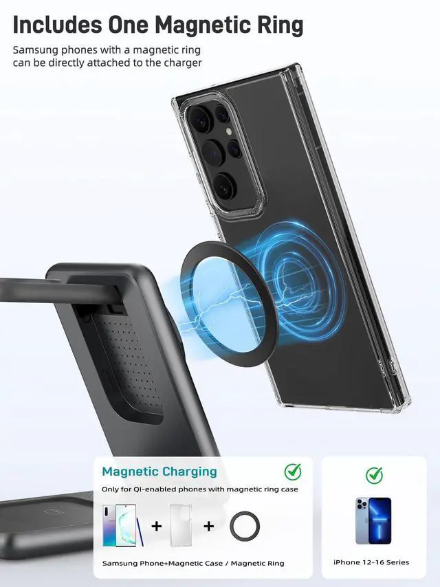 | Compatible Phone Models | Phone Compatible with Samsung S25 Ultra/S25+/S25/S24 Ultra/S24+/S24/S23 Ultra/S23+/S23/S22/S22+/S22 Ultra/S21 FE/Z Fold 6/Z Flip 6/Z Fold 5/Z Flip 5/Z Fold 4/Z Flip 4/Z Fold 3/Z Flip 3/S21/S21 Ultra/S20/S20 Ultra/S10/Note 10/Note 9 and moreiPhone 16/16 Plus/16 Pro/16 Pro Max/15/15 Plus/15 Pro/15 Pro Max/iPhone 14/14 Pro Max/14 Plus/14 Pro/iPhone 13/13 Pro/13 Pro Max/13 Mini/12/12 Pro/12 Pro Max/12 Mini/11/11 Pro/11 Pro Max/SE/XS MAX/X/XR/8/8 Plus; Google Pixel 8/8 Pro/7/7 Pro/6/6 Pro and other phones that support wireless charging |