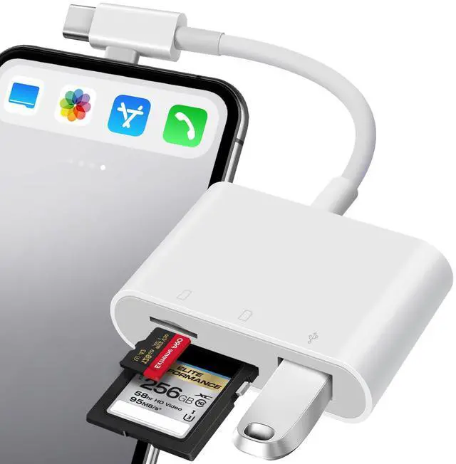 Insert your memory card (SD/microSD) into the card reader. Plug the card reader directly into your iPhone port.