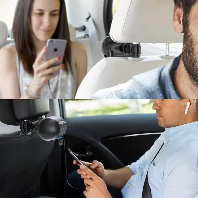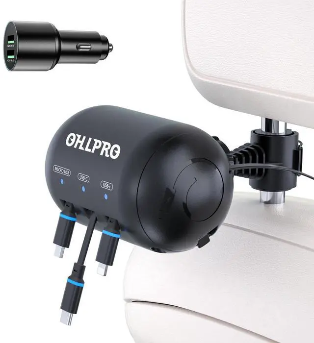 Features: Multi-Car Retractable Cord 3-in-1 Power Charging Station Car Charger, Type C, Micro USB Compatible Mobile Phone and Tablet Fast Charging Station, Suitable for Back Seat Passengers. Installed behind the headrest of the car seat.