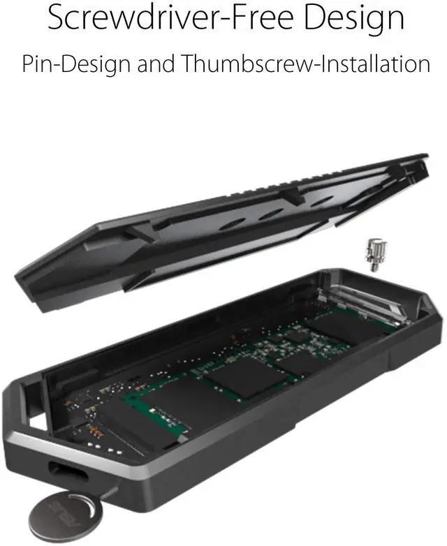 ROG Strix Arion features a push-pin design and a thumbscrew locking mechanism to secure the SSD into the enclosure. No screwdriver is required.