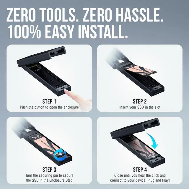 Upgrade, swap, and access your M.2 SSDs with ease using the SABRENT USB 3.2 Tool-Free Enclosure, designed for speed, convenience, and portability. The 100% tool-free design allows you to install or remove compatible SSDs in seconds, making it ideal for quick upgrades, backups, and data transfers without downtime.