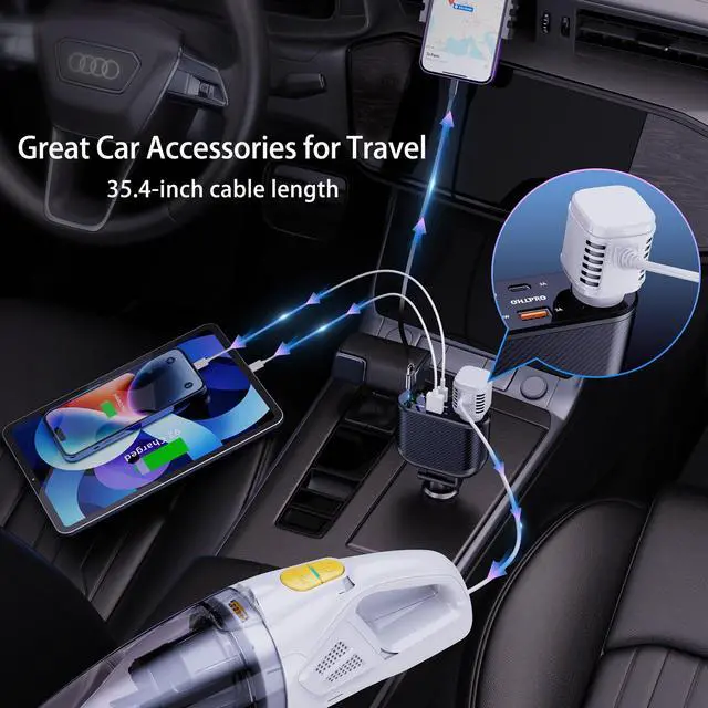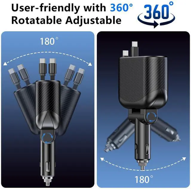This car charger features storage and organization with 2 retractable Type-C charging cable, 2 USB-A/USB-C ports, 1 cigarette lighter socket, which can be easily retracted by pulling it, so you won't have to worry about tangled cables anymore.