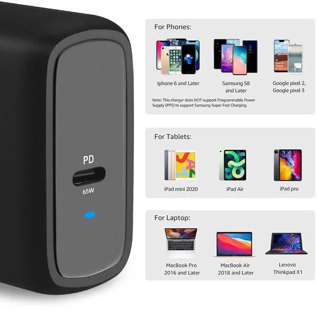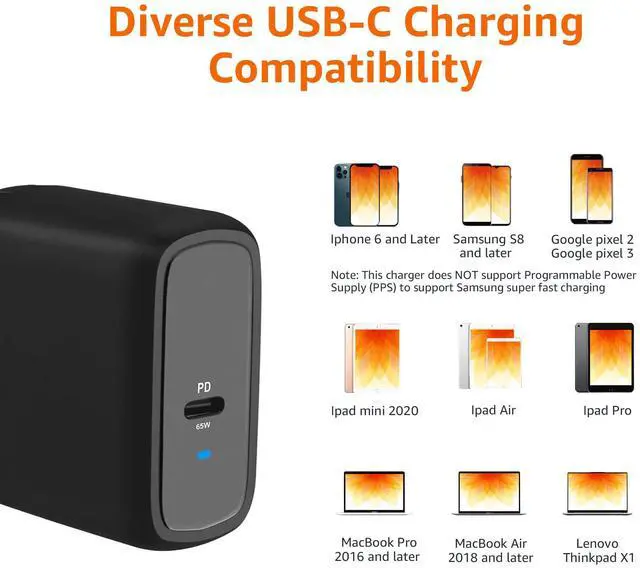 Fast charging: 65-watt USB Power Delivery PD 3.0 for high-speed charging of compatible devices, like iPhone, iPad Pro, Samsung Galaxy, MacBook Air, MacBook Pro, and more