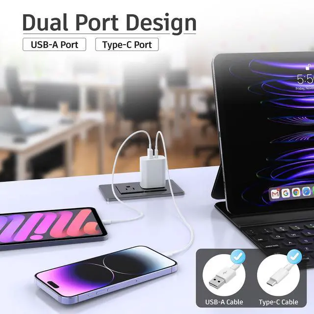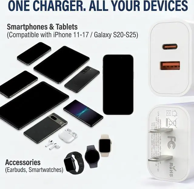 Universal Compatibility: The 20W Dual Port PD+QC Charger is compatible with a wide variety of devices, including the latest smartphone models, as well as a range of other PD and QC-enabled devices. Its versatility ensures that you won't need multiple chargers for your different gadgets.