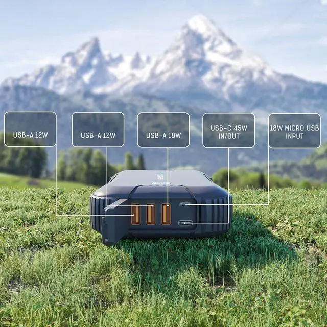 Versatile Charging Options - The power bank features 4 output ports, including a 45W USB-C PD port, one 18W USB-A port & two 12W USB-A ports.