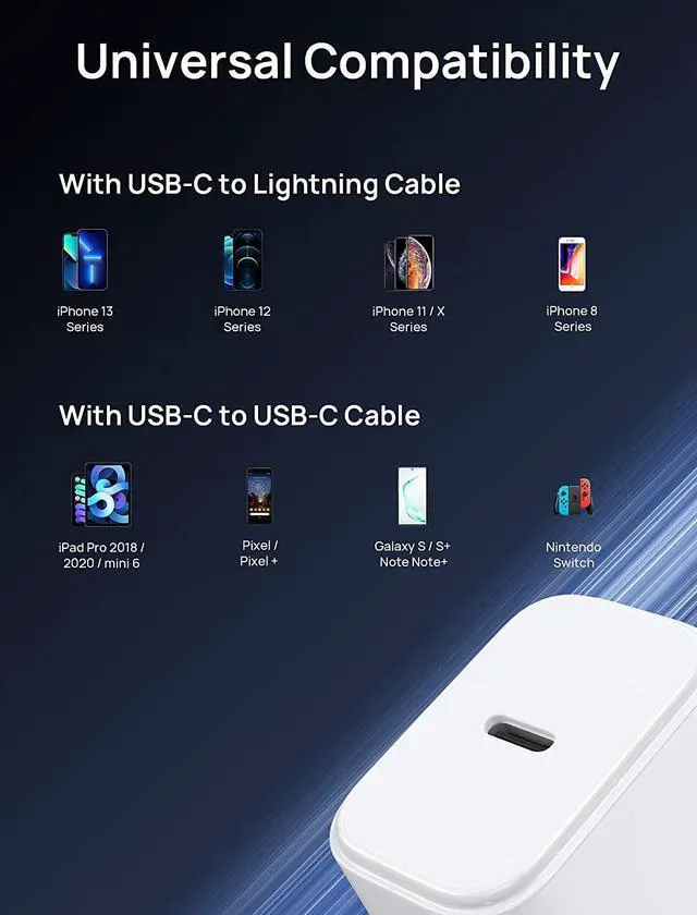 [Specifically Designed]: 20W USB C Charger Designed for iPhone 13/13 Mini/13 Pro/13 Pro Max/12/12 Mini/12 Pro/12 Pro Max/11/11 Pro Max/11 Pro/XS/8Plus, iPad Pro/ Air, Google Pixel 5/4/3 XL, Galaxy S20/S10, Note 20/10, and other Type-C devices that support USB Power Delivery.