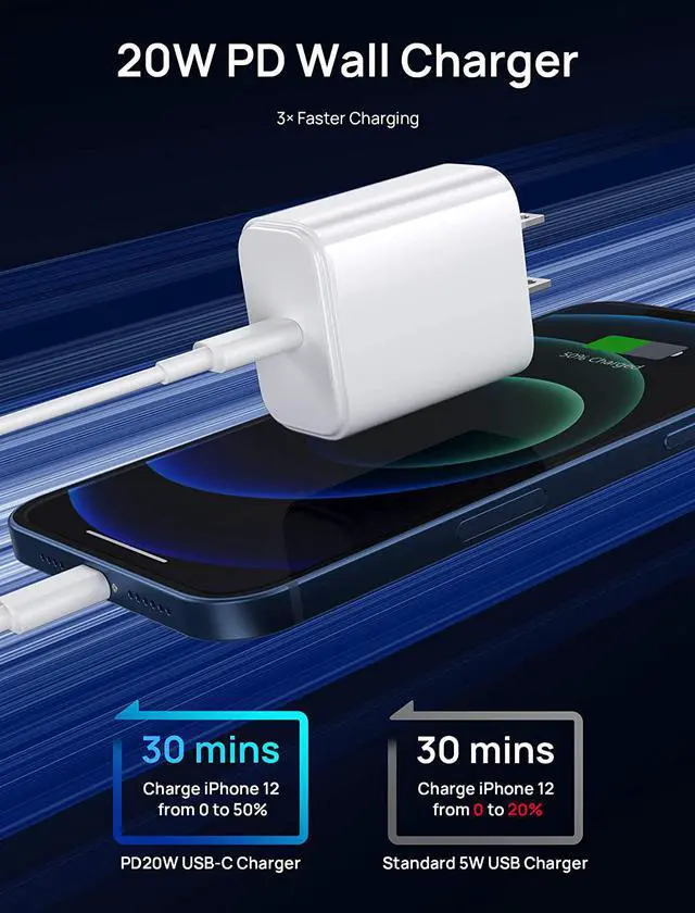 [3X Faster Charging]: Compared with the 5W original charger, this 20W USB C fast charger can charge your USB-C PD-smartphone or tablet to 50% power in just 30 minutes.