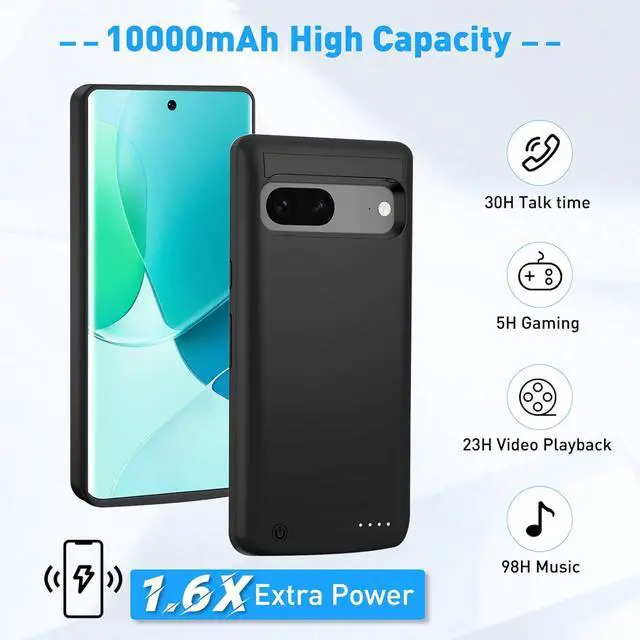 Protective Phone Case with Battery for Pixel 7 - This external phone battery case not only gives longer battery life but also offering great protection to your phone. The soft silicone and hard shell exterior of pixel 7 charging case is good enough to protect your pixel 7 from drops and dings, while the microfiber lining inside helps keep your phone free from scratches from dust and dirt particles. A screen protector is recommend to use as this case does not protect the screen.