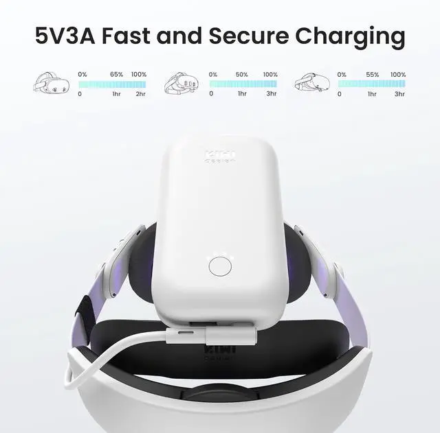 Charge Faster, Play Longer: KIWI design battery pack supports a maximum output current of 20W to fully charge Quest 2 in just 2.5h and provides almost 2 charges for Quest. We suggest using another USB C-USB C cable to charge Quest 3. If you want to use our USB A-USB C cable to charge Quest 3, please keep Quest 3 active during the charging process.