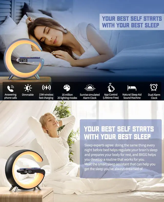 15W Wireless Fast Charging, Sleep Lamp, Sunrise Wake-Up Lamp, Atmosphere Lamp, Bedside Lamp, Dazzling Light Effect, Bluetooth Speaker Audio, Clock, Alarm Clock
