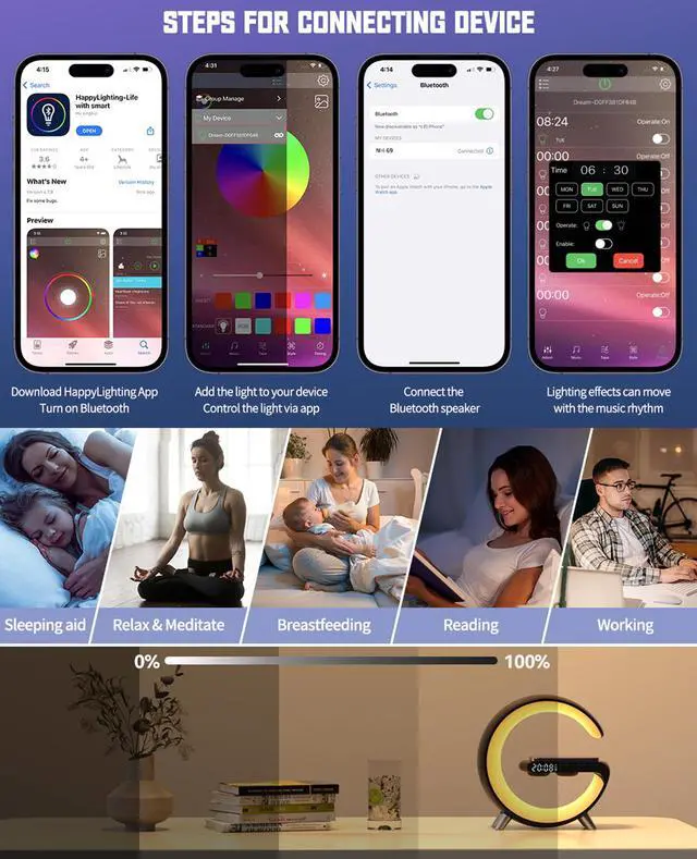 You can adjust the noise, volume, lights color and brightness from APP and personalize a healthy sleep-wake routine. The Alarm Clock with snooze is gentle and peaceful to help your body wake up more gradually.