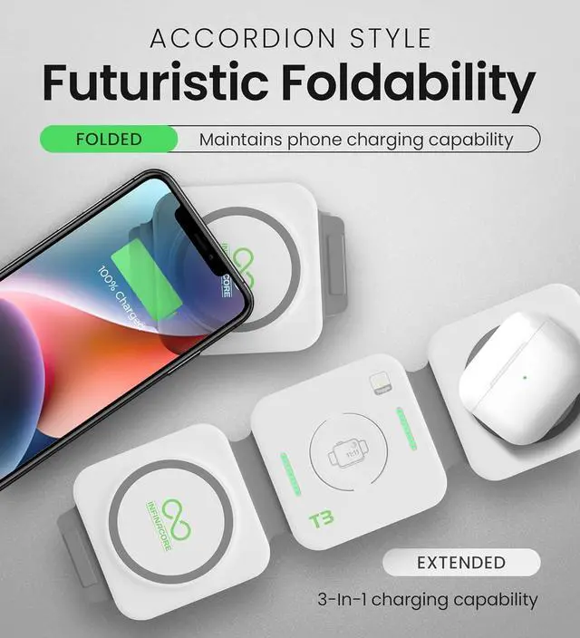This ItemInfinaCore 3-in-1 Charging Station for Apple Devices - Magnetic Wireless Travel Charger for Multiple Devices - Foldable Charging Pad for Magsafe iPhone 15 14 13 12 Pro Max/Plus, AirPods & Apple WatchRecommendationsQUMOX Wireless Charger 2 in 1,Mini Magnetic Travel Wireless Charging Station Multiple Devices, 2 in 1 Charging Station,Compatible for iPhone15/14/13/12/Pro/Max,iWatch,AirPods 3/2/Pro New Criacr 3 in 1 Magnetic Foldable Wireless Charger, Wireless Charging Station for Travel, Compatible with iPhone 14/Pro/Max/Plus/13/12, Apple Watch, AirPods Pro EXW Foldable 3 in 1 Wireless Charging Station for Apple Compatible with Mag Safe Charger Stand,Magnetic Wireless Charger Station for iPhone 16 15 14 13 12 Series,Airpods Pro,Apple Watch (All Black) JARGOU Apple Charging Station: 3 in 1 Wireless Charger for iPhone 16/15/14/13/12, Apple Watch S10/Ultra2/SE & AirPods 4/Pro 2 - Foldable Travel Wireless Charging Station with Fast Adapter Wireless Charger for iPhone, RTOPS 3 in 1 Magnetic Foldable Charging Station for Multiple Device Apple, 18W Fast Charger Stand for iPhone 15 14 13 12, iWatch & Airpods, (Adapter Included) W-312