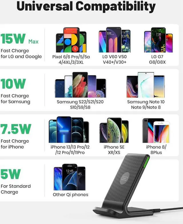 4 Upgraded Charging Modes A high-efficiency chip provides 15W fast charge for LG, 10W fast charge for Samsung Galaxy, 7.5W fast charge for iPhone, and 5W standard charge.
