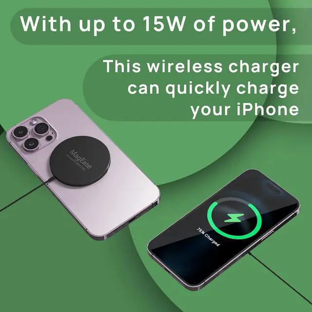Fast Charging: With up to 15W of power, MagEase wireless charger can quickly charge your iPhone 15/14/13/12 models, providing up to 50% charge in just 30 minutes.
