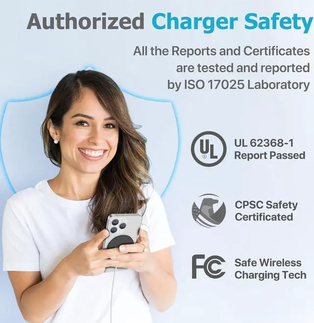 Charger Saftey: Our Wireless chargers have passed the certification requirements of FCC, CPSC, and UL 62368-1, ensuring compliance with applicable standards. For Canada Market, We tested and passed the certification of ISED by Industry Canada Dept. All reports and certificates have undergone rigorous testing and review by an ISO 17025 laboratory.