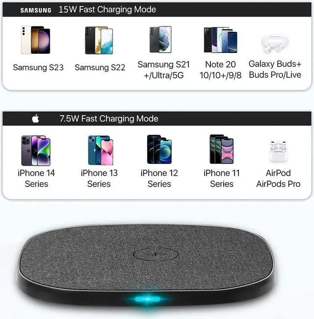 Fast Charging Modes: 15W Fast Charging for Samsung (QC 3.0 Samsung Galaxy S23/S22/S21/S20/S10/S9 / S8/S8+/S7/Note10/9/8/5), 7.5W Fast Charging for iPhone (iPhone 15/14/13/12/11/ Pro Max/XS/XR/X/8 plus), 5W standard charging for Nokia 822, Google NEXUS 7, 10W Fast Charging for Huawei Mate 60/20 Pro and all QI-Enabled smartphones.
