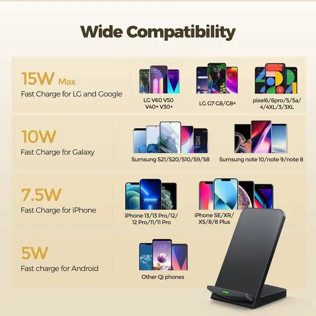 The fast wireless phone charger stand provides a 15W fast charge for LG V50/V40/V30, 15W (Max) fast charge for Galaxy S21Ultra/S20/S10/S9/S8/S7/Note 20 Ultra/Note 20/10/9/8, 15W (Max) fast charge for iPhone 14/13/12 Pro Max/11/SE/XS/XR/X/8/8 plus and 5W standard charge for other phones.